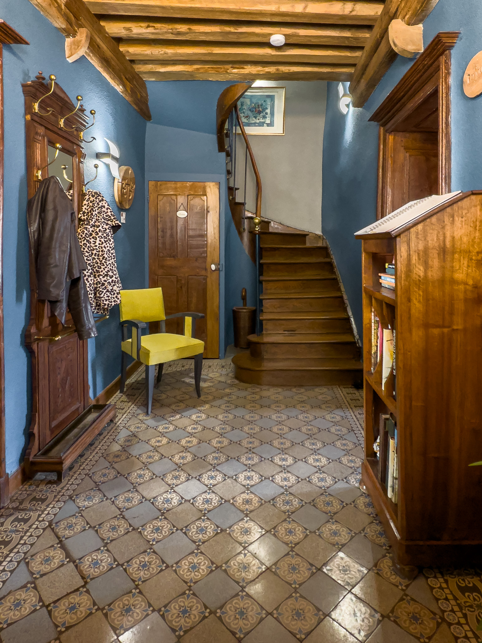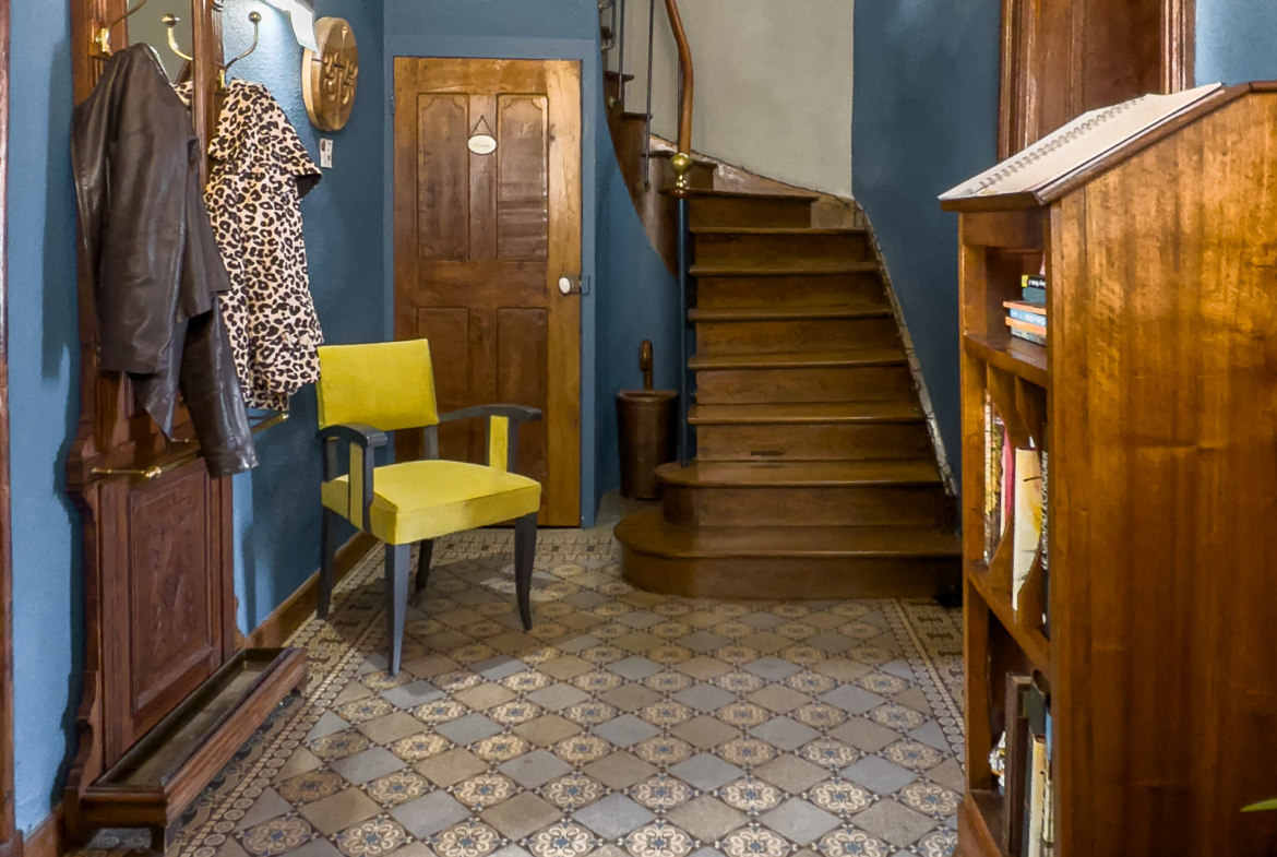 L’entrée, habillée de carreaux de ciment et de boiseries anciennes, donne immédiatement le ton.